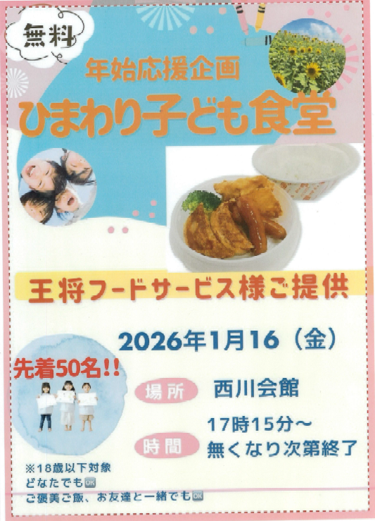 2026年1月11日 / 最終更新日時 : 2026年1月11日 himawari-k 未分類 王将フードサービス提供 2026年1月16日王将フードサービスでお弁当が50食提供されます 持ち帰り用です。 コメントを残す コメントをキャンセルメールアドレスが公開されることはありません。 ※ が付いている欄は必須項目ですコメント ※ 名前 ※ メール ※ サイト 次回のコメントで使用するためブラウザーに自分の名前、メールアドレス、サイトを保存する。 Δ